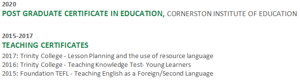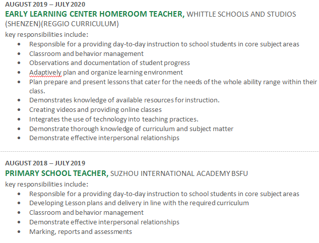 2015年:TEFL基金會-以英語作為外語/第二語言教學(xué) 2013年獲得自由國立大學(xué)(BSC)地質(zhì)榮譽(yù) 2018年8月– 2019年7月 蘇州國際學(xué)校BSFU小學(xué)教師 2019年8月– 2020年7月 早教中心的家庭教師,(深圳)(REGGIO課程) |
