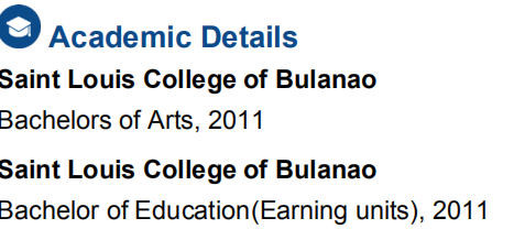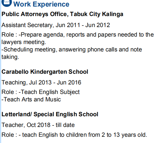 教學(xué)經(jīng)驗(yàn):卡拉貝洛幼兒園學(xué)校 教學(xué),2013年7月-2016年6月 角色:-教英語(yǔ)科目 -教授藝術(shù)和音樂 萊特蘭/特殊英語(yǔ)學(xué)校 老師,2018年10月-至今 角色:-為2到13歲的孩子教英語(yǔ) 教育背景: 布蘭瑙圣路易斯學(xué)院 2011年本科 教育專業(yè) |