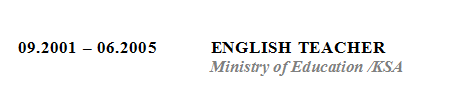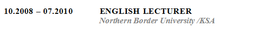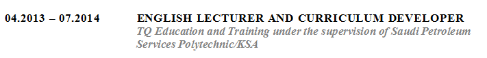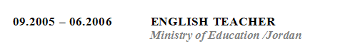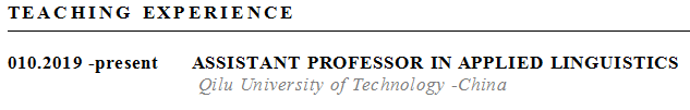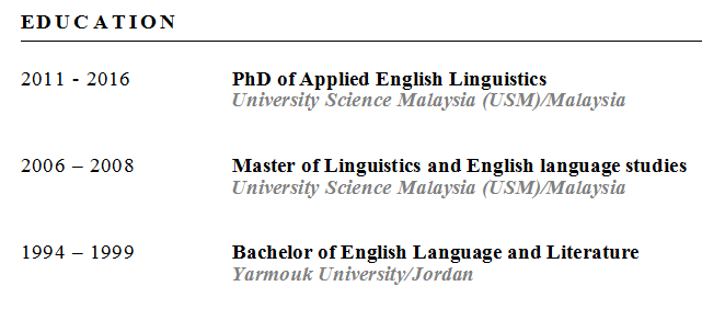 010.2019-至今應用語言學助理教 齊魯工業(yè)大學-中國 02.2017 -02-2018英語語言講師和ESL教練 在卓越學院-沙特阿拉伯的監(jiān)督下進行國際學習和就業(yè)服務 04.2013 – 07.2014英語講師和課程開發(fā) 在沙特石油服務職業(yè)技術學院/ KSA的監(jiān)督下進行TQ教育和培訓 10.2008 – 07.2010英語講師 北部邊境大學/ KSA 09.2005 – 06.2006英語老師 教育部/約旦 09.2001 – 06.2005英語老師 教育部/ KSA 08.1999 – 09.2001英語老師 教育部/約旦 教育背景: 2011年-2016年應用英語語言學博士學位 馬來西亞大學科學(USM)/馬來西亞 2006年– 2008年語言學和英語語言學碩士 馬來西亞大學科學(USM)/馬來西亞 1994年– 1999年,英語語言文學士學位 耶爾穆克大學/約旦 |