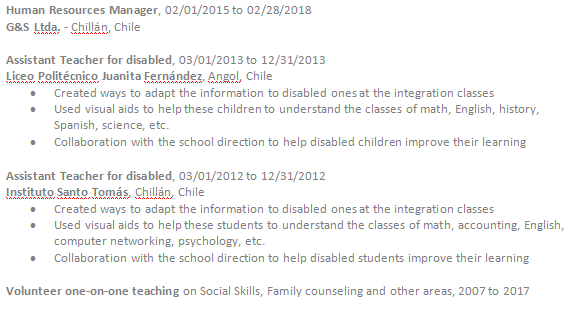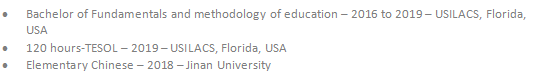 助理老師,2013年3月1日至2013年12月31日 LiceoPolitécnicoJuanitaFernández,智利安哥拉 志愿者一對一的社交技能,家庭咨詢和其他領(lǐng)域的教學(xué),2007年至2017年 ?基礎(chǔ)和教育學(xué)學(xué)士– 2016年至2019年–美國佛羅里達(dá)州USILACS ?120小時TESOL – 2019 – USILACS,美國佛羅里達(dá) ?基礎(chǔ)漢語– 2018 –暨南大學(xué) |