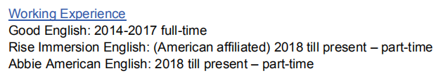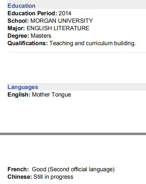 教育背景: 學(xué)制:2014年 學(xué)校:摩根大學(xué) 專業(yè):英語(yǔ)文學(xué) 學(xué)位:碩士 教學(xué)經(jīng)驗(yàn): 良好的英語(yǔ):2014-2017年全職 Rise Immersion英語(yǔ):(美國(guó)附屬公司)2018年至今–兼職 阿比美國(guó)英語(yǔ):2018年至今–兼職  |