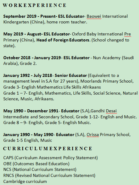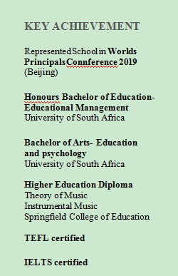 主要成就 代表學(xué)校參加2019年世界校長(zhǎng)大會(huì)(北京) 榮譽(yù)教育學(xué)士-南非教育管理大學(xué) 文學(xué)學(xué)士-教育和心理學(xué) 南非大學(xué) 高等教育文憑 音樂理論 器樂 斯普林菲爾德教育學(xué)院 托福認(rèn)證雅思認(rèn)證 工作經(jīng)歷 2019年9月至今——英語教育者——魏豹國際幼兒園(中國),家庭教師。 2019年5月-2019年8月——英語教育者——牛津國際幼兒中心(中國),外國教育者負(fù)責(zé)人。(學(xué)校改為州立)。 2018年10月至2019年1月——英語教師——修女學(xué)院(沙特阿拉伯),二年級(jí)。 1992年1月至2018年7月——高級(jí)教育家(相當(dāng)于27年的高級(jí)管理水平),摩爾蘭小學(xué)三年級(jí)——英語數(shù)學(xué)生活技能南非荷蘭語 1-7年級(jí)——英語、數(shù)學(xué)、生活技能、社會(huì)科學(xué)、自然科學(xué)、音樂、南非荷蘭語。 1990年5月至1991年12月----甘地德賽中學(xué)1-12年級(jí)教師----英語和音樂。8-9年級(jí)——英語,5年級(jí)——英語音樂。 1990年1月至1990年5月----奧里薩小學(xué)一至五年級(jí)英語、音樂教師 中國紅十字會(huì) 基于結(jié)果的教育 國家課程聲明 RNCS(修訂的國家課程聲明)劍橋課程 國際學(xué)士學(xué)位(PYP-小學(xué)課程) 蒙臺(tái)梭利 |