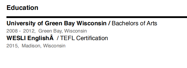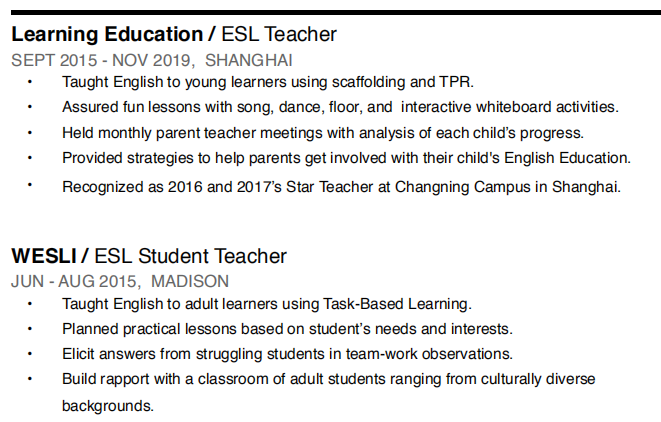 教育 威斯康星格林灣大學(xué)/文學(xué)學(xué)士 2008 - 2012,威斯康星州格林灣 威斯里英語/外語教學(xué)證書 2015年,威斯康星州麥迪遜 學(xué)習(xí)教育/英語教師 2015年9月-2019年11月,上海 使用腳手架和主題方案報告向年輕學(xué)生教授英語。 有保證的有趣課程,包括歌曲、舞蹈、舞池和交互式白板活動。 每月召開家長教師會議,分析每個孩子的進步。 提供策略幫助家長參與孩子的英語教育。 被上海長寧校區(qū)評為2016年和2017年的明星教師。 英語作為第二語言的學(xué)生教師 2015年6月至8月,麥迪遜 使用任務(wù)型學(xué)習(xí)向成人學(xué)習(xí)者教授英語。 根據(jù)學(xué)生的需求和興趣計劃實踐課程。 在團隊合作觀察中從苦苦掙扎的學(xué)生那里獲得答案。 與不同文化背景的成人學(xué)生建立融洽的關(guān)系 背景。 |