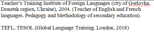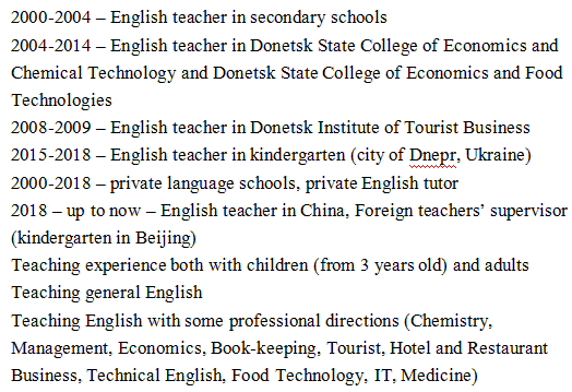 2000-2004年–中學英語老師 2004-2014年–頓涅茨克州立經(jīng)濟與化學技術(shù)學院和頓涅茨克州立經(jīng)濟與食品技術(shù)學院的英語老師 2008-2009年–頓涅茨克旅游商業(yè)學院英語老師 2015-2018年–幼兒園的英語老師(烏克蘭第聶伯市) 外語教師培訓學院(烏克蘭頓涅茨克州戈爾洛夫卡市),2004年。(英語和法語教師,中學教育學和方法論)。 TEFL,TESOL |