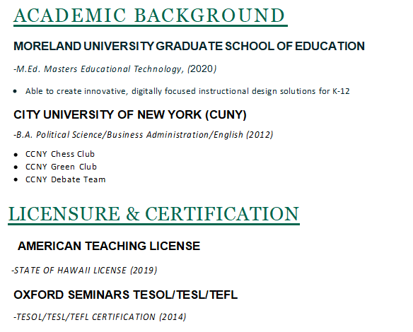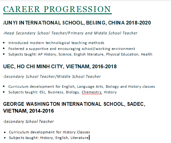 職業(yè)發(fā)展 中國(guó)北京君逸國(guó)際學(xué)校2018-2020 中學(xué)部主任/中小學(xué)主任 引入現(xiàn)代技術(shù)教學(xué)方法 營(yíng)造支持和鼓勵(lì)的學(xué)校/工作環(huán)境 授課科目:AP歷史,科學(xué),英語(yǔ)文學(xué),體育,健康 南胡志明市UEC,2016-2018年 -中學(xué)老師/中學(xué)老師 英語(yǔ),語(yǔ)言藝術(shù),生物學(xué)和歷史課的課程開(kāi)發(fā)授課科目:ESL,商業(yè),生物學(xué),化學(xué),歷史 2014年-2016年,越南沙特阿拉伯喬治華盛頓國(guó)際學(xué)校 -中學(xué)老師 摩爾蘭德大學(xué)研究生教育學(xué)院 -M.Ed.碩士教育技術(shù),(2020年 TESOL |