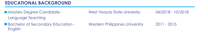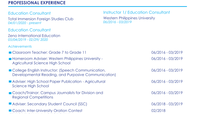 課堂老師:7年級(jí)至11年級(jí)06/2016-03/2019:西菲律賓大學(xué)-06/2016-03/2019 農(nóng)業(yè)科學(xué)高中 大學(xué)英語(yǔ)講師: 教練/教練:校園記者和部門負(fù)責(zé)人06/2016-03/2019 區(qū)域比賽 顧問:中學(xué)生會(huì)(SSC)06/2018-03/2019 教練:大學(xué)間演說比賽02/2018 1994年5月27日出生 菲律賓 碩士學(xué)位04/2018-10/2018 語(yǔ)言教學(xué) 中等教育學(xué)士-西菲律賓大學(xué)2011年-2015年 英語(yǔ) |
