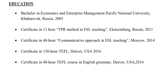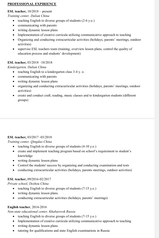 ESL老師,2018年10月–至今 中國大連培訓(xùn)中心 ?向不同類型的學(xué)生教授英語(每年2-6歲) ?與父母溝通 ?編寫動態(tài)的課程計劃 ?利用交流方法實施創(chuàng)造性課程 ?組織和開展課外活動(節(jié)假日,家長會議,戶外活動) 活動) ?監(jiān)督ESL教師團(tuán)隊(培訓(xùn),概述課程計劃,控制教師的質(zhì)量 教育過程和學(xué)生發(fā)展) ESL老師,03/2018 – 10/2018 中國大連幼兒園 ?在幼兒園3-4年級教授英語。 ?與父母溝通 ?編寫動態(tài)的課程計劃 ?組織和開展課外活動(節(jié)假日,家長會議,戶外活動) 活動) ?創(chuàng)建并進(jìn)行手工藝,閱讀,音樂課以及面向幼兒園學(xué)生(不同 組) 該 ESL老師,03/2017 -03/2018 中國青島培訓(xùn)中心 ?向不同類型的學(xué)生教授英語(4-10歲) ?根據(jù)學(xué)校對學(xué)生的要求,制定并實施教學(xué)計劃 知識 ?編寫動態(tài)的課程計劃 ?通過組織和進(jìn)行考試和測試來控制學(xué)生的成功 ?進(jìn)行課外活動(節(jié)假日,家長會,戶外活動) ESL老師,09 / 2016-02 / 2017 中國德州私立學(xué)校 ?向不同類型的學(xué)生教授英語(每年7-15歲) ?編寫動態(tài)的課程計劃。 ?進(jìn)行課外活動(節(jié)假日,家長聚會) 2014-2016年英語老師 非國立教育中心,俄羅斯哈巴羅夫斯克 ?向不同類型的學(xué)生教授英語(每年7-15歲) ?利用交流方法實施創(chuàng)造性課程 ?編寫動態(tài)的課程計劃。 ?進(jìn)行資格和國家英語考試的輔導(dǎo) 教育 ?太平洋國立大學(xué)經(jīng)濟(jì)學(xué)和企業(yè)管理學(xué)士學(xué)位, 俄羅斯哈巴羅夫斯克,2003年 ?2011年在俄羅斯葉卡捷琳堡獲得12小時“ ESL教學(xué)中的TPR方法”證書 ?2014年,莫斯科40小時“ ESL教學(xué)中的交流方法”證書 ?2016年美國丹佛120小時TEFL證書 ?2016年美國丹佛40個小時英語語法TEFL課程證書 |