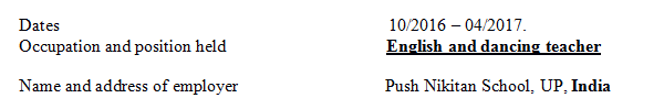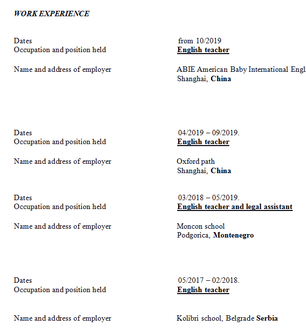 教學(xué)經(jīng)驗: 10/2019 職業(yè)和職位擔任英語老師 愛貝 上海,中國 04/2019 – 09/2019。 職業(yè)和職位擔任英語老師 牛津路徑 上海,中國 03/2018 – 05/2019。 職業(yè)和職位擔任英語老師和法律助理 雇主蒙孔學(xué)校 黑山共和國波德戈里察 05/2017 – 02/2018。 職業(yè)和職位擔任英語老師 塞爾維亞貝爾格萊德Kolibri學(xué)校 10/2016 – 04/2017。職業(yè)和職位舉行英語和舞蹈老師 印度 教育背景: 2017年歐洲研究資格碩士。 機構(gòu)碩士對歐洲法律的研究 國家和歐洲研究學(xué)院 2010年資格律師 機構(gòu)法律學(xué)院 黑山大學(xué) |