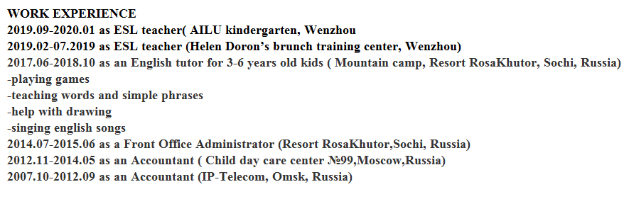 老師正在尋找一份為期一年的合同,為2到6歲的孩子擔任英語老師。在過去的三年里,我一直在和小孩子打交道,我們一直在學習英語。  |