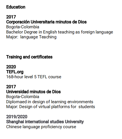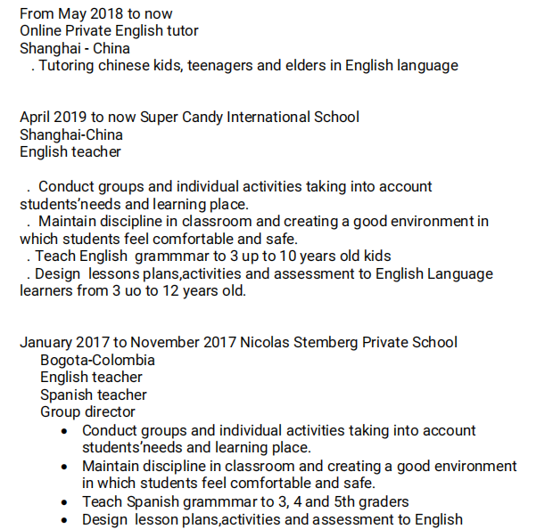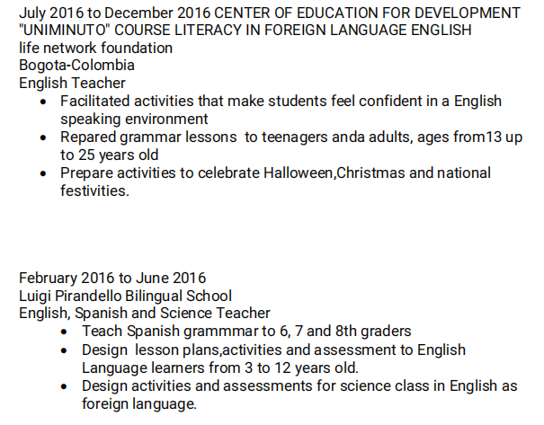 教育2017 corporación universtatariamintosdios Bogota-Columbia學(xué)士學(xué)位英語教學(xué)外語專業(yè):語言教學(xué)培訓(xùn)和證書 2020 TEFL.org 168小時第5級2017年大學(xué)課程波哥大-Columbia大學(xué)文憑設(shè)計語言環(huán)境專業(yè):虛擬平臺設(shè)計 2019/2020上海國際大學(xué)中文專業(yè)課程 從2018年5月到新的在線私人英語教師中國上海。2019年4月20日中國兒童、青少年和老年人英語學(xué)習(xí)日在上海國際學(xué)校舉行,中國英語教師。開展小組和個人活動,考慮學(xué)生的需求和學(xué)習(xí)場所。。在教室里保持紀(jì)律,創(chuàng)造一個讓學(xué)生感到舒適和安全的良好環(huán)境。.教10歲以下的孩子英語語法。無設(shè)計計劃、活動和評估英語語言學(xué)習(xí)者年齡從3歲到12歲。 2017年1月20日至2017年11月尼古拉成員學(xué)校波哥大-哥倫比亞英語教師西班牙語教師小組組長開展小組和個人活動,考慮學(xué)生的需求和學(xué)習(xí)場所。在教室里保持紀(jì)律,創(chuàng)造一個讓學(xué)生感到舒適和安全的良好環(huán)境。教西班牙語語法3、4和5年級學(xué)生無設(shè)計的計劃、活動和評估英語語言學(xué)習(xí)者3至12歲。使用技術(shù)來學(xué)習(xí)國際化學(xué)習(xí),并使課程具有反應(yīng)性。準(zhǔn)備活動慶祝萬圣節(jié)、圣誕節(jié)、兒童節(jié)和全國性節(jié)日。 2016年7月26日12月2016教育促進發(fā)展中心“UNIMINUTO”課程英語外語英語生活網(wǎng)絡(luò)基金會波哥大-哥倫比亞英語教師促進活動讓學(xué)生感到自信英語演講環(huán)境為青少年和成年人(年齡從13歲到25歲)準(zhǔn)備活動慶祝感恩節(jié)、圣誕節(jié)和全國性節(jié)日。 2016年2月至2016年6月母語雙語學(xué)校英語、西班牙語和科學(xué)教師教師西班牙語語法教師6、7和8年級學(xué)生無設(shè)計的計劃、活動和評估英語語言學(xué)習(xí)者3至12歲。設(shè)計活動和評估科學(xué)輔助工具作為外語 |