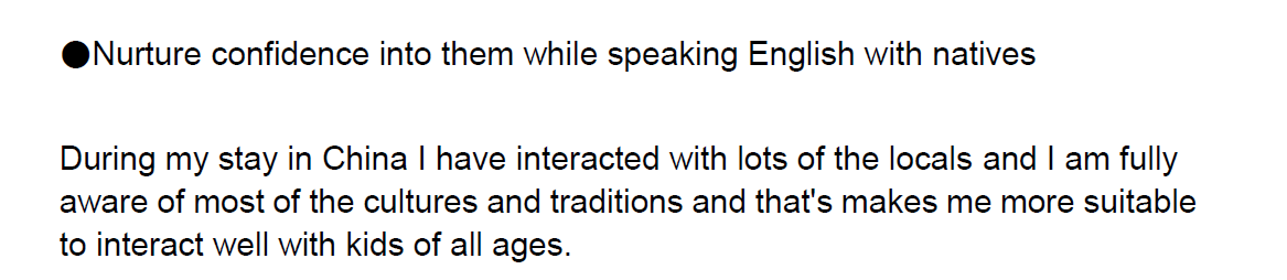 能讓學(xué)生輕松流利地說出心中所想。利用我在這個(gè)奇妙的國家(中國)教英語所獲得的巨大技能。我鼓勵(lì)所有的學(xué)生參與到活動(dòng)和游戲中來,在學(xué)習(xí)英語的過程中營造一個(gè)愉快的氛圍,讓所有的學(xué)生都有愉快的體驗(yàn)。 |