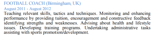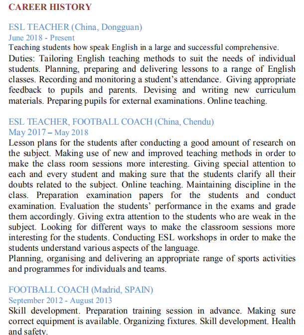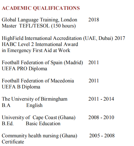 教學(xué)經(jīng)驗(yàn): ESL老師(中國,東莞)2018年6月-現(xiàn)在 ESL老師,足球教練(中國,成都)2017年5月– 2018年5月 足球教練(西班牙馬德里)2012年9月-2013年8月 足球教練(英國伯明翰)2011年8月-2012年8月 教育背景: 全球語言培訓(xùn),倫敦2018掌握TEFL / TESOL(150小時(shí)) 高地國際認(rèn)證(阿聯(lián)酋,迪拜)2017HABC 2級(jí)國際大獎(jiǎng) 西班牙足球聯(lián)合會(huì)(馬德里)2011歐足聯(lián)專業(yè)文憑 馬其頓足球聯(lián)合會(huì)2011UEFA B文憑 伯明翰大學(xué)2011年-2014年英語學(xué)士 開普敦大學(xué)(加納)2008-2010 基礎(chǔ)教育 2005-2008年加納社區(qū)衛(wèi)生護(hù)理證書  |