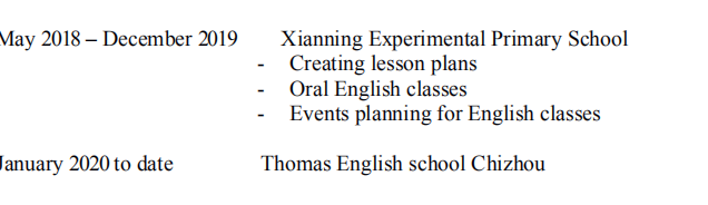 教學經驗: 2018年5月至2019年12月在咸寧實驗小學任ESL教師 2018年5月– 2019年12月咸寧實驗小學 2020年1月至今 安徽省池州市托馬斯英語學?,F(xiàn)任英語教師 教育背景: 2017:TEFL 2013年-2017年BSC市場營銷-國立科技大學 2011年-2012年3個“ A”級地理會計和地理。 2007年-2010年10個GCSE幾內亞家禽高中 |