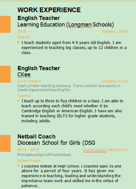 學(xué)習(xí)教育(朗文學(xué)校) 2019 教師 中國上海 我教4-9歲的學(xué)生英語。我有教大班的經(jīng)驗(yàn),一個(gè)班最多12個(gè)孩子。 2019年至今 中國上海 小型私人教學(xué)公司。培訓(xùn)兒童和成人 劍橋和美國英語。教師 我一個(gè)班最多教三至五個(gè)孩子。我能夠 根據(jù)每個(gè)孩子的需要來教,不管是劍橋英語還是美式英語。我也接受過為高年級(jí)學(xué)生(包括成人)教授雅思的培訓(xùn)。 |