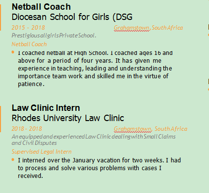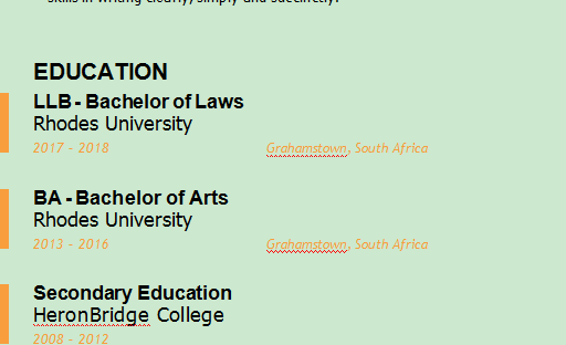 教育 法學(xué)學(xué)士 羅茲大學(xué) 2017-2018年 南非格拉漢姆鎮(zhèn) 文學(xué)學(xué)士 羅茲大學(xué) 2013-2016年 南非格拉漢姆鎮(zhèn) 中等教育 海倫布里奇學(xué)院 2008-2012年 中國工作經(jīng)驗(yàn)