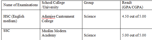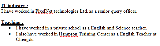 我曾在一所私立學(xué)校擔(dān)任英語和科學(xué)老師。 ?我也曾在漢普森培訓(xùn)中心擔(dān)任成都英語老師 HSC(英語中等)Adamjee州立學(xué)院 |
