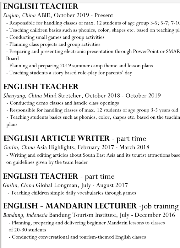 印度尼西亞, 在宿遷, 工作簽證 -購銷經(jīng)理職位, 有tefl, 轉(zhuǎn)聘 可以拿到解聘書, 會漢語,碩士(中國)-漢語教育 ,本科(印度尼西亞)-旅游管理,沈陽工作一年經(jīng)驗, 宿遷愛貝一年經(jīng)驗, 求職廣州 丈夫在廣州天河。 10月工作。 幼兒園和公立有限考慮。 |