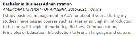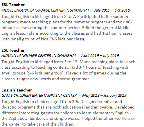 ESL老師 上海兒童英語(yǔ)語(yǔ)言中心// 2019年7月– 2019年10月 ESL老師 上海愛都琳語(yǔ)言中心// 2019年4月– 2019年7月 英語(yǔ)老師 游戲兒童娛樂中心// 2018年5月– 2019年1月 教育 工商管理學(xué)士 120小時(shí)TEFL課程 |