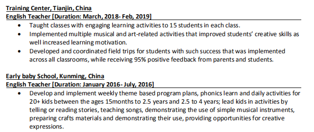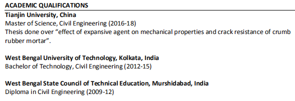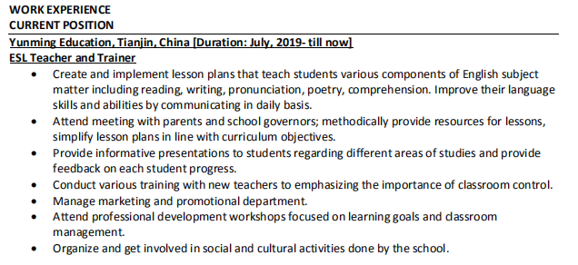 教學(xué)經(jīng)驗: 中國天津,云明教育[持續(xù)時間:2019年7月-至今]ESL老師和培訓(xùn)師 天津培訓(xùn)中心 英語老師[時間:2018年3月-2019年2月] 昆明幼兒學(xué)校 英語老師[時間:2016年1月至2016年7月 教育背景: 中國天津大學(xué)土木工程理學(xué)碩士(2016-18) 西孟加拉工業(yè)大學(xué),印度加爾各答 土木工程技術(shù)學(xué)士(2012-15) 西孟加拉邦技術(shù)教育國務(wù)委員會,印度默西達(dá)巴德 土木工程文憑(2009-12 |