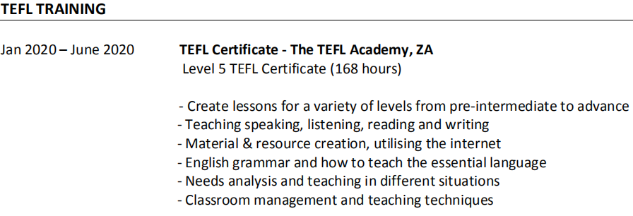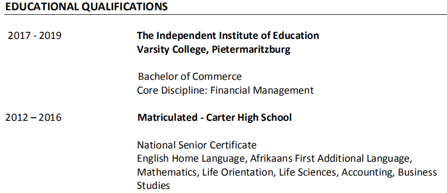 教學(xué)經(jīng)驗(yàn): 2017-2019彼得馬里茨堡大學(xué)獨(dú)立教育學(xué)院大學(xué)商學(xué)學(xué)士 核心學(xué)科:財(cái)務(wù)管理2012 – 2016入讀卡特高中國(guó)家高級(jí)證書(shū)英語(yǔ)家庭語(yǔ)言,南非荷蘭語(yǔ)第一附加語(yǔ)言數(shù)學(xué),生活方向,生命科學(xué),會(huì)計(jì),商業(yè)研究 有TEFL |