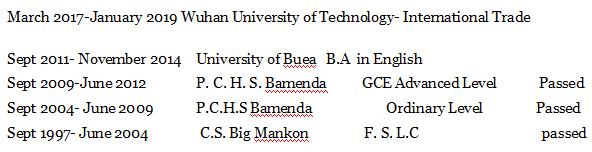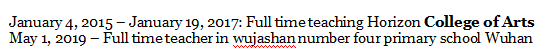 2015年1月4日至2017年1月19日:全職教授地平線藝術(shù)學(xué)院 2019年5月1日–武漢武嘉山第四小學(xué)全職老師 2017年3月至2019年1月武漢理工大學(xué)國際貿(mào)易學(xué)院 2011年9月至2014年11月,布阿大學(xué)英語專業(yè) |