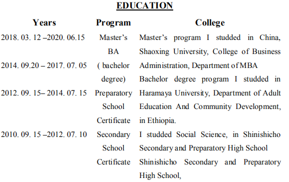 工作經(jīng)驗(yàn) 我在小學(xué)當(dāng)了兩年的英語(yǔ)老師 教育 2018.03.12-2020.06.15我在中國(guó)紹興大學(xué)商學(xué)院學(xué)習(xí)碩士研究生 2014.09.20-2017.07.05我專攻的是學(xué)士學(xué)位課程 2012.09.15-2014.07.15埃塞俄比亞哈拉瑪亞大學(xué)學(xué)校教育和社區(qū)發(fā)展證書 2010.09.15-2012.07.10初中學(xué)習(xí)社會(huì)科學(xué) 初中有附中和初高中 |
