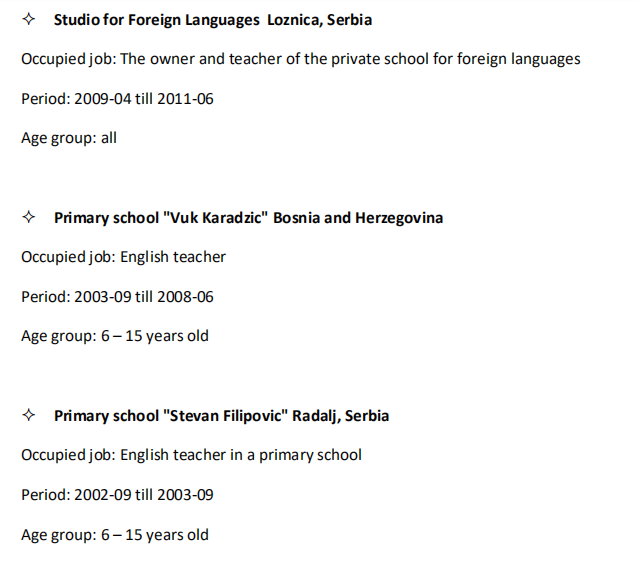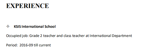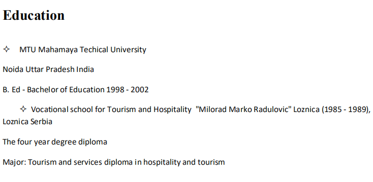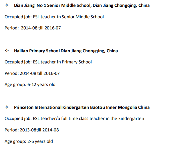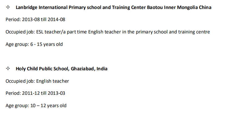 教育 ? MTU Mahamaya技術(shù)大學(xué) 印度北方邦 B.教育學(xué)學(xué)士,1998 - 2002年 ?旅游和接待職業(yè)學(xué)校" milorad Marko radulovic " loznica(1985-1989年), 塞爾維亞洛茲尼察 四年制學(xué)位證書 專業(yè):旅游和服務(wù),酒店和旅游文憑 KSIS國際學(xué)校 職業(yè):國際部二年級教師、班主任 期間:2016-09至今 中國重慶市?墊江第一高級中學(xué) 職業(yè):高中英語教師 期間:2014-08至2016-07 中國重慶市?海聯(lián)小學(xué) 職業(yè):小學(xué)英語教師 期間:2014-08至2016-07 年齡組:6-12歲 中國內(nèi)蒙古包頭市?普林斯頓國際幼兒園 職業(yè):英語教師/幼兒園全職班主任 期間:2013-08至2014-08 年齡組:2-6歲 中國內(nèi)蒙古包頭市?藍(lán)橋國際小學(xué)及培訓(xùn)中心 期間:2013-08至2014-08 職業(yè):小學(xué)和培訓(xùn)中心的英語教師/兼職英語教師 年齡組:6 - 15歲 |