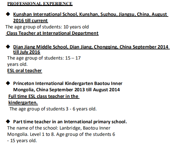 自我介紹,介紹年齡,國籍,學(xué)歷 ,專業(yè),工作 經(jīng)歷(曾在美國公司),之后來到中國教學(xué),重慶,昆山等教學(xué)經(jīng)歷,負責(zé)工作努力---發(fā)音超級棒!經(jīng)驗很豐富~