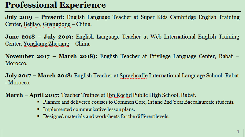 自我介紹,介紹國籍,學歷和專業(yè),碩士,tefl,本國教學經驗,小學,中學都有經驗,中國經驗--發(fā)音棒棒噠,經驗豐富~