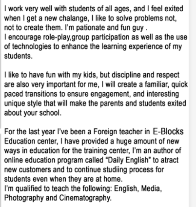 國籍: 俄羅斯 求職意向: 教師