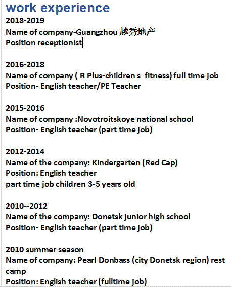 教育背景: 2014年,完成了國立體育大學(xué)頓涅茨克州立大學(xué)健康,體育與運(yùn)動(dòng)學(xué)院的全部課程 烏克蘭體育 教學(xué)經(jīng)驗(yàn): 2018-2019 公司名稱-廣州越秀地產(chǎn) 職位接待員 2016-2018 公司名稱(R Plus-兒童健身)全職工作 職位-英語老師/體育老師 2015-2016 公司名稱:Novotroitskoye國立學(xué)校 職位-英語老師(兼職) 2012-2014 公司名稱:幼兒園(紅色ap) 職位:英語老師 3-5歲兒童的兼職工作 2010--2012 公司名稱:頓涅茨克初中 職位-英語老師(兼職)