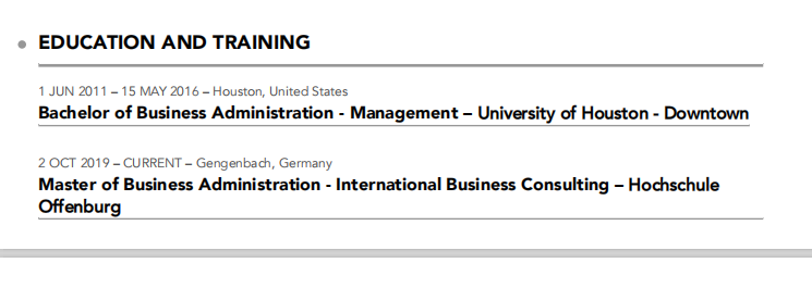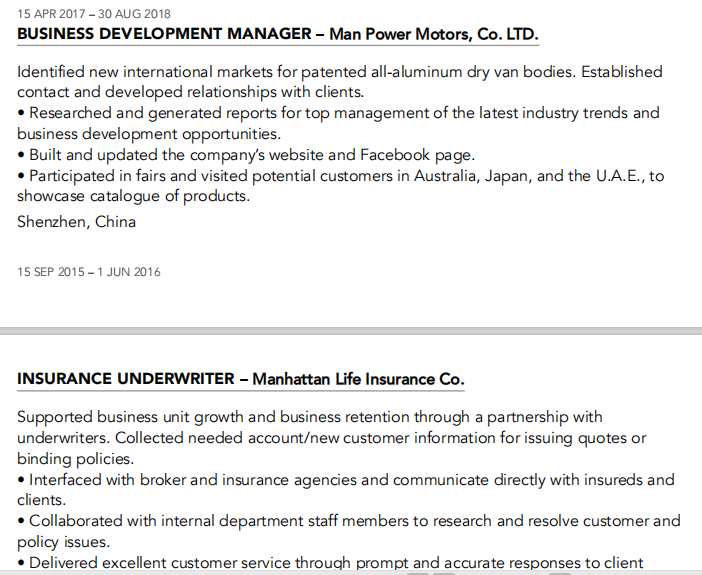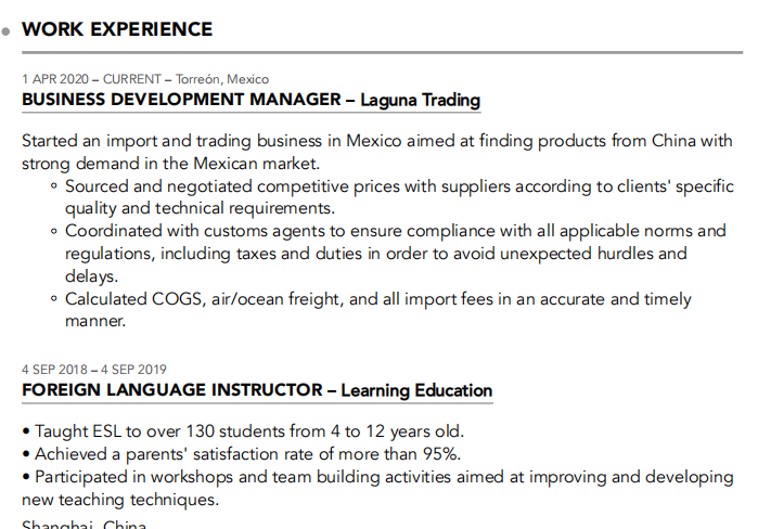教育和培訓 2011年6月1日–2016年5月15日–美國休斯頓 休斯頓大學商業(yè)管理學士 2019年10月2日–當前–德國根巴赫 工商管理碩士-國際商務咨詢-大學 奧芬堡 工作經(jīng)驗 2020年4月1日–當前–墨西哥托雷翁 拉古納貿(mào)易公司業(yè)務發(fā)展經(jīng)理 在墨西哥開展進口和貿(mào)易業(yè)務,旨在從中國尋找產(chǎn)品 墨西哥市場的強勁需求。 ♀根據(jù)客戶的具體情況,尋找并與供應商協(xié)商有競爭力的價格 質(zhì)量和技術要求。 與海關人員協(xié)調(diào),確保遵守所有適用的規(guī)范 法規(guī),包括稅收和關稅,以避免意外的障礙和 延遲。 準確、及時地計算銷貨成本、空運/海運以及所有進口費用 態(tài)度。 2018年9月4日–2019年9月4日 外語教師-學習教育 向130多名4至12歲的學生教授英語。 父母滿意度達到95%以上。 參加旨在改進和發(fā)展的講習班和團隊建設活動 新的教學技術。 中國上海 2017年4月15日–2018年8月30日 業(yè)務發(fā)展經(jīng)理——曼動力汽車有限公司 確定了專利全鋁干式貨車車體的新國際市場。確定的 聯(lián)系并發(fā)展與客戶的關系。 為最高管理層研究并生成最新行業(yè)趨勢的報告 商業(yè)發(fā)展機會。 建立和更新公司網(wǎng)站和臉書頁面。 參加交易會,拜訪澳大利亞、日本和歐盟的潛在客戶,以 展示產(chǎn)品目錄。 中國深圳 |