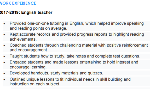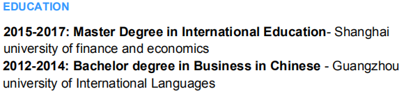 工作經(jīng)歷 2017-2019英語教師 提供一對一的英語輔導(dǎo),幫助提高口語,平均閱讀分?jǐn)?shù)保存準(zhǔn)確的記錄,并提供進(jìn)度報告以突出閱讀成就。通過具有積極強(qiáng)化作用的挑戰(zhàn)性材料指導(dǎo)學(xué)生 和鼓勵。教會學(xué)生如何學(xué)習(xí)、記筆記和完成試題。讓學(xué)生參與進(jìn)來,讓課程變得有趣,以保持興趣,鼓勵學(xué)習(xí)。制作講義、學(xué)習(xí)材料和測驗。概述了適合個人技能培養(yǎng)需求的獨(dú)特課程每個科目的說明。 教育 2015-2017:國際教育碩士-上海 財經(jīng)大學(xué) 2012-2014:中國商務(wù)學(xué)士學(xué)位-廣州 國際語言大學(xué) |