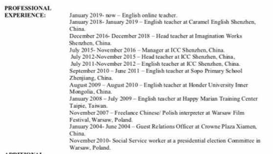 自我介紹,介紹 10年多教學(xué)經(jīng)驗(yàn)。之前在中國(guó)教學(xué),因?yàn)橐咔榛貒?guó)。希望盡快回來工作---發(fā)音好,經(jīng)驗(yàn)十分豐富