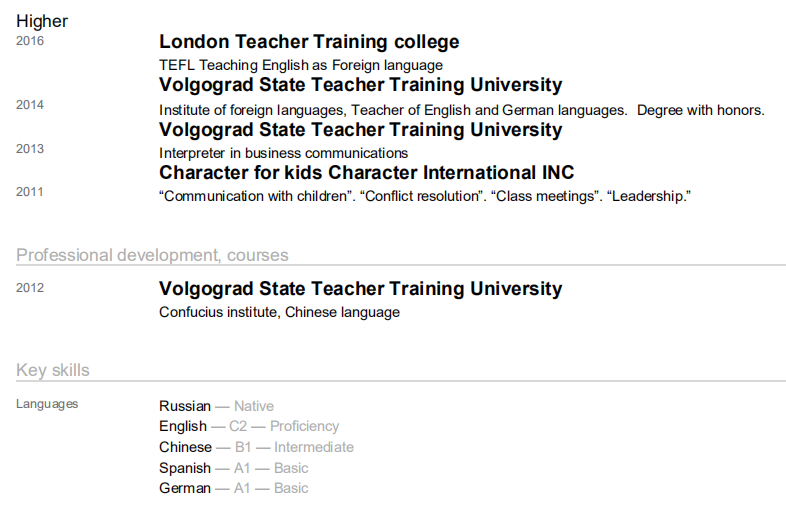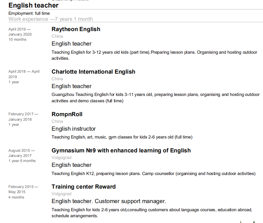國籍: 俄羅斯 求職意向: 教師