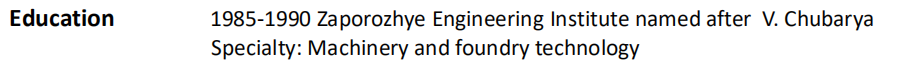 教育經(jīng)歷 1985-1990 :工程學(xué)院 專(zhuān)業(yè):機(jī)械和鑄造技術(shù) 教學(xué)經(jīng)驗(yàn): 2014年7月– 2016年9月 實(shí)驗(yàn)室負(fù)責(zé)人。 Zaporozhye國(guó)立技術(shù)大學(xué)。 2011年9月至2017年2月 英語(yǔ)導(dǎo)師 1990年9月至2014年6月首席工程師。 2017年2月至7月浙江玉鷹職業(yè)技術(shù)學(xué)院 中國(guó)杭州。 商務(wù)英語(yǔ)老師。 2017年9月– 2020年1月。寧波市外事學(xué)校。 口語(yǔ)英語(yǔ)老師。 中國(guó)寧波。 2018年9月至2020年1月。寧波海曙外國(guó)語(yǔ)學(xué)校 會(huì)話(huà)英語(yǔ)老師。