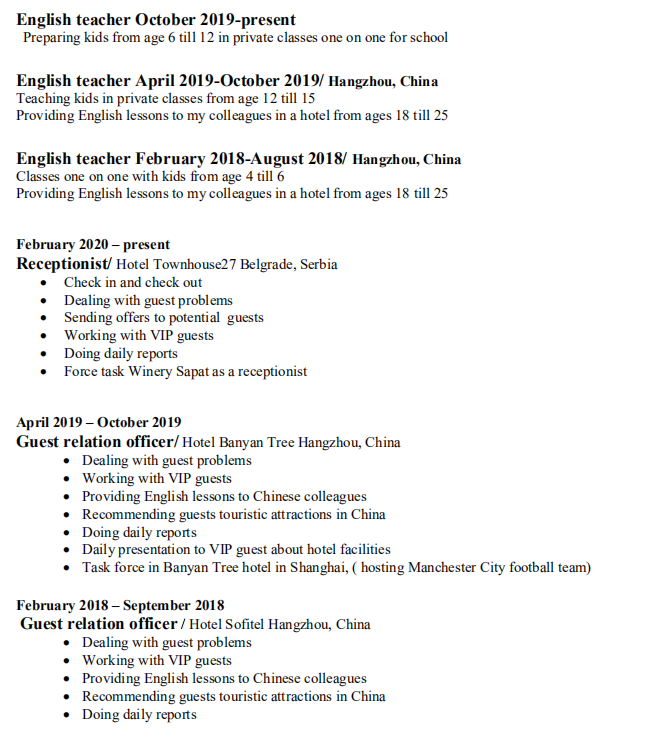 商務(wù)專業(yè),剛畢業(yè),TEFL 學(xué)習(xí)中,在塞爾維亞,求職可以辦理工簽的職位,之前在杭州工作過2年,可以免簽入境然后辦理工簽,發(fā)音很好 |