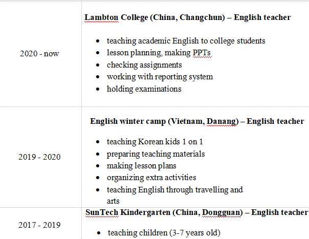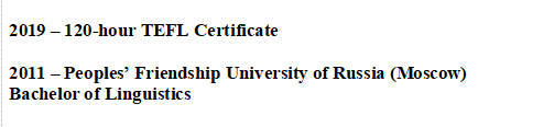 國籍: 俄羅斯 求職意向: 教師