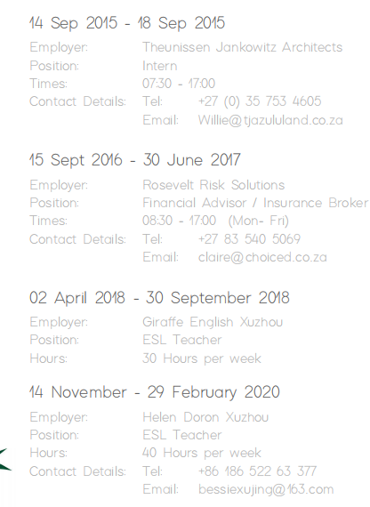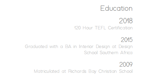 本科室內(nèi)設(shè)計專業(yè),有TEFL,在徐州工作過,現(xiàn)在在南非 ,求職上海、杭州或蘇州 |