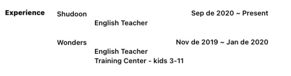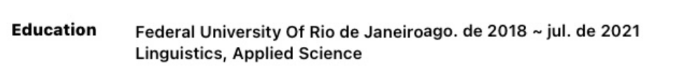 教學(xué)經(jīng)驗:2020/9-現(xiàn)在 英語老師(SHudoon) 2019/11-2020/1:英語老師 培訓(xùn)機構(gòu) 教育背景:2018/12-2021/7 里約熱內(nèi)盧聯(lián)邦大學(xué) 語言學(xué)和應(yīng)用科學(xué) |