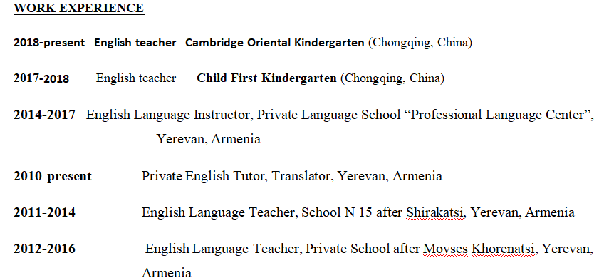亞美尼亞, 在重慶, 工作簽轉(zhuǎn)聘, 預計到校時間年后, 有孩子和媽媽(家屬簽),有經(jīng)驗 求職福建, 廣東等地職位, ,確定工作提出離職。-求職幼兒園職位。 |