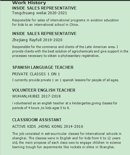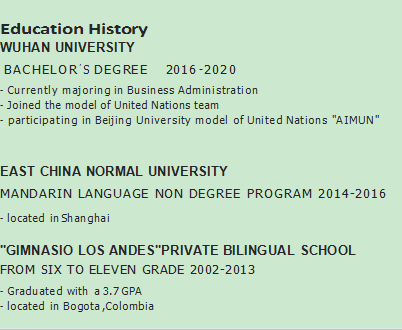 教育史 武漢大學(xué) 學(xué)士學(xué)位2016-2020 -目前主修工商管理 -加入了聯(lián)合國小組的模式 -參加聯(lián)合國“愛盟”北京大學(xué)模式 華東師范大學(xué) 2014-2016年漢語非學(xué)位項(xiàng)目 -位于上海 “吉納西奧洛斯安第斯”私立雙語學(xué)校 從六年級到十一年級2002-2013 -以3.7的平均績點(diǎn)畢業(yè) -位于哥倫比亞波哥大 工作經(jīng)歷 內(nèi)部銷售代表 同創(chuàng)威來2020-2021 負(fù)責(zé)向中國的國際學(xué)校銷售兒童航空教育的國際項(xiàng)目。 內(nèi)部銷售代表 浙江瑞富2019-2020 負(fù)責(zé)拉丁美洲地區(qū)的商業(yè)和客戶。我為客戶提供農(nóng)用化學(xué)品的最佳解決方案,并在獲得植物檢疫注冊所需的過程中給予支持。 西班牙語教師 1上1節(jié)私人課 我目前為所有年齡段的人提供一對一的私人西班牙語課程。 志愿英語教師 湖北武漢2017-2018 我志愿在幼兒園當(dāng)英語老師,給5到8歲的孩子上4個(gè)小時(shí)的課。 課堂助手 活躍的孩子,香港2014-2016 這份工作包括上海國際學(xué)校的課外班。這些課程是英語的,針對6至12歲的孩子,每個(gè)課程的主要目的是讓孩子們通過有趣的實(shí)驗(yàn)(比如上海的火箭或粘液)來學(xué)習(xí)科學(xué)。 |