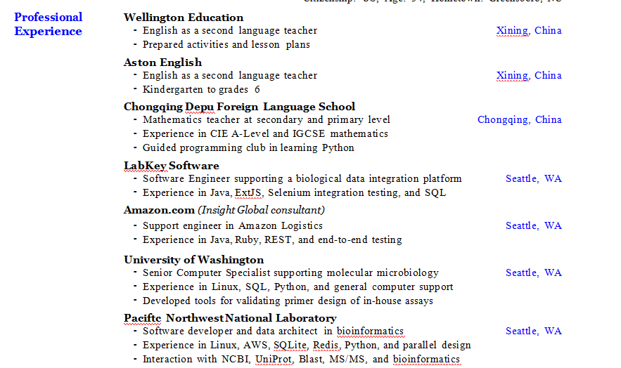 美國, 在青海西寧, 工簽轉(zhuǎn)聘, 盡快可以, 不限制培訓(xùn)班 , 薪資 17-20 不要住宿,盡快到。 |