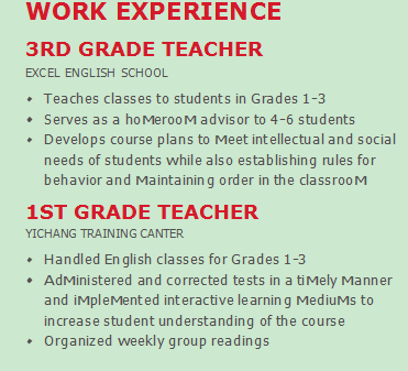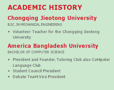 工作經(jīng)驗(yàn) 三年級教師 卓越英語學(xué)校 給1-3年級的學(xué)生上課,給4-6年級的學(xué)生當(dāng)班主任 制定課程計(jì)劃,以滿足學(xué)生的智力和社會需求,同時建立行為規(guī)則,維護(hù)課堂秩序 一年級教師 宜昌培訓(xùn)中心 為1-3年級開設(shè)英語課,及時管理和糾正考試,并實(shí)施互動學(xué)習(xí)媒體,以提高學(xué)生對課程的理解。組織每周小組閱讀 學(xué)術(shù)史 重慶交通大學(xué) 機(jī)械工程學(xué)士 重慶交通大學(xué)志愿者教師 美國孟加拉大學(xué) 計(jì)算機(jī)科學(xué)學(xué)士 輔導(dǎo)俱樂部和計(jì)算機(jī)語言俱樂部的主席和創(chuàng)始人 學(xué)生會主席辯論隊(duì)副主席 |