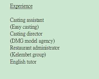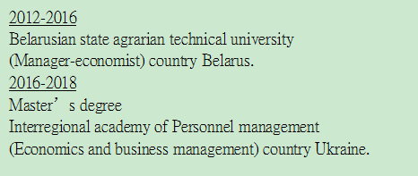 教育: 2012-2016年 白俄羅斯國家農(nóng)業(yè)技術(shù)大學(xué) (經(jīng)理-經(jīng)濟(jì)學(xué)家)國家白俄羅斯。 2016-2018年 碩士學(xué)位 區(qū)域間人事管理學(xué)院 (經(jīng)濟(jì)和商業(yè)管理)國家烏克蘭。 經(jīng)驗(yàn) 選角助理 (容易鑄造) 星探 (DMG模特經(jīng)紀(jì)公司) 餐廳管理員 (Kelembet集團(tuán)) 英語家教 |