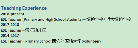 stefy+阿根廷女+碩士,tefl+學(xué)校辦理的工簽+求職3點以后職位和周末全天+目前在西安雁塔(教小學(xué)),盡快到 |