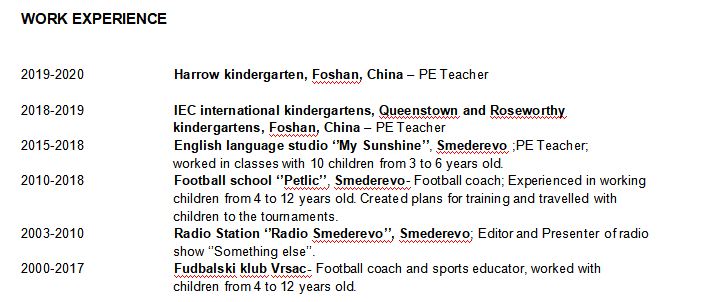 塞爾維亞, 在佛山, 家屬簽一年,體育 足球可以教 求職佛山職位。廣州也考慮, 幼兒園職位最好, 體育也可以。 |