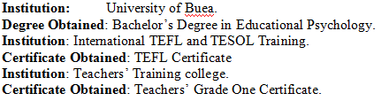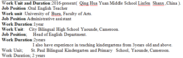 國籍: 津巴布韋 求職意向: 教師