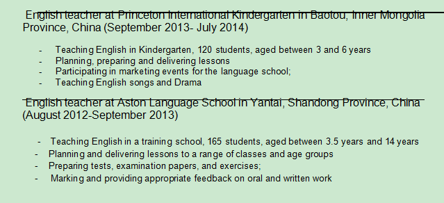 自我介紹,介紹年齡,目前和丈夫和孩子在中國,能教各種年齡的學生,培訓,幼兒園,小學都有經(jīng)驗,也曾在泰國教學。個人優(yōu)勢--發(fā)育好,經(jīng)驗豐富