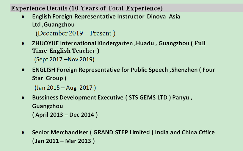 國籍: 巴基斯坦 求職意向: 教師